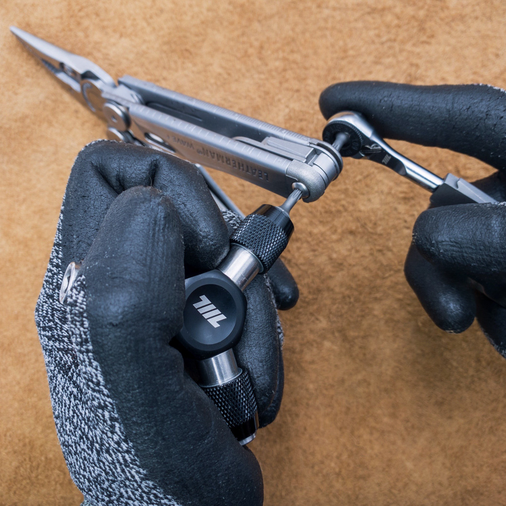 The 711L EDC 1/4” flex head ratchet wrench has a flat end that is compatible with Leatherman multitools accepting Leatherman proprietary flat screwdriver bits, including Leatherman Arc, Wave+, Charge, Skeletool, MUT, Super Tool, Surge, Signal & Curl. It just slots straight in. The flex head adds a new dimension of flexibility to increase the functionality of your Leatherman tool!